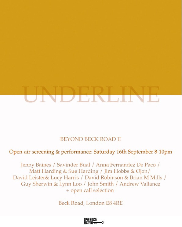 Featuring film and performance from: Kim Walker, Max Vallance, Milan & all at no. 35, Lula Ings, No. 47: A Disobedience Collective, Elizabeth Hobbs, E.E., Jenny Baines, Lynn Loo, Livia Garcia with Sue Lynch & Adrian Northover, Lucy Harris, David Leister, Simon Payne with Alex Ward, Guy Sherwin, Rowland Hill, Andrew Vallance, Jim Hobbs & Ojon