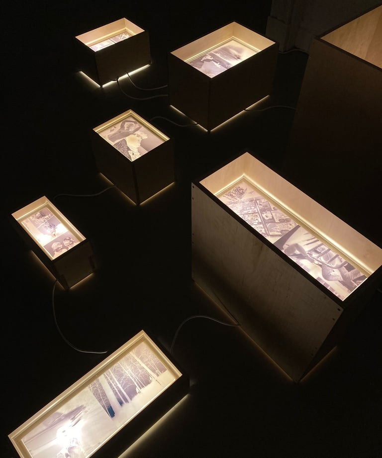 A memory work that takes the form of a series of free-standing individually sized photographic light boxes, which represent personal archival images and address how identities are bound to one-another, as well as place and time.
