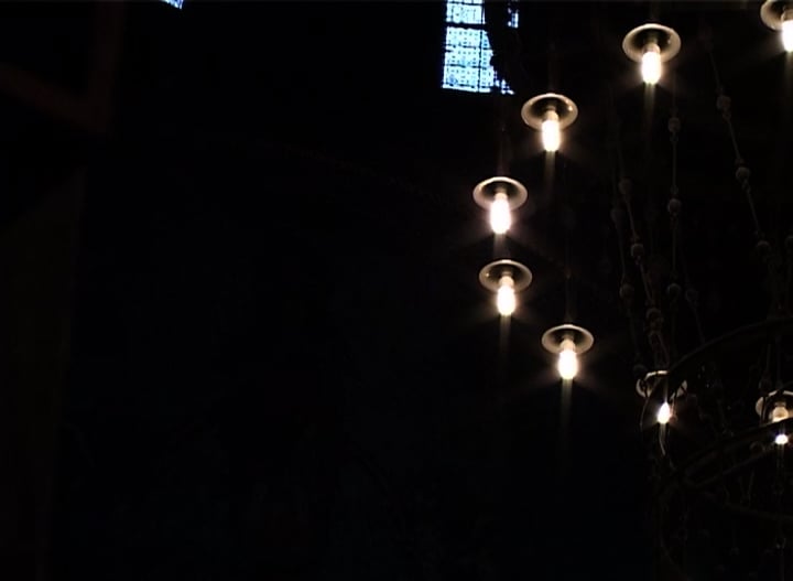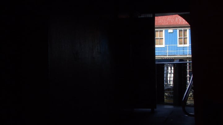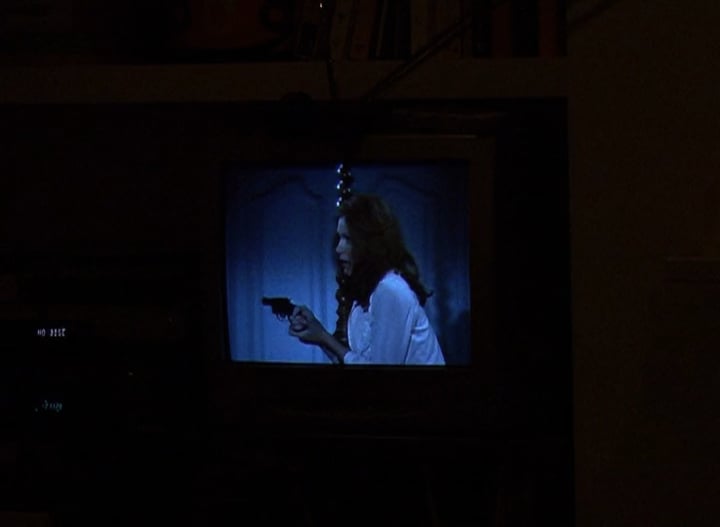 A domestic scene: dark garden, washing blows on a line, television plays inside a house. The sound and image of a detective show inter-cuts with the exterior environment, altering it and bringing violence to the conjoined night.