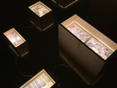 A memory work that takes the form of a series of free-standing individually sized photographic light boxes, which represent personal archival images and address how identities are bound to one-another, as well as place and time.